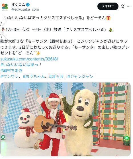 2025年12月3日4日放送の「いないいないばあっ!クリスマスすぺしゃる」では、ちーサンタの登場でSNSが盛り上がっていました。